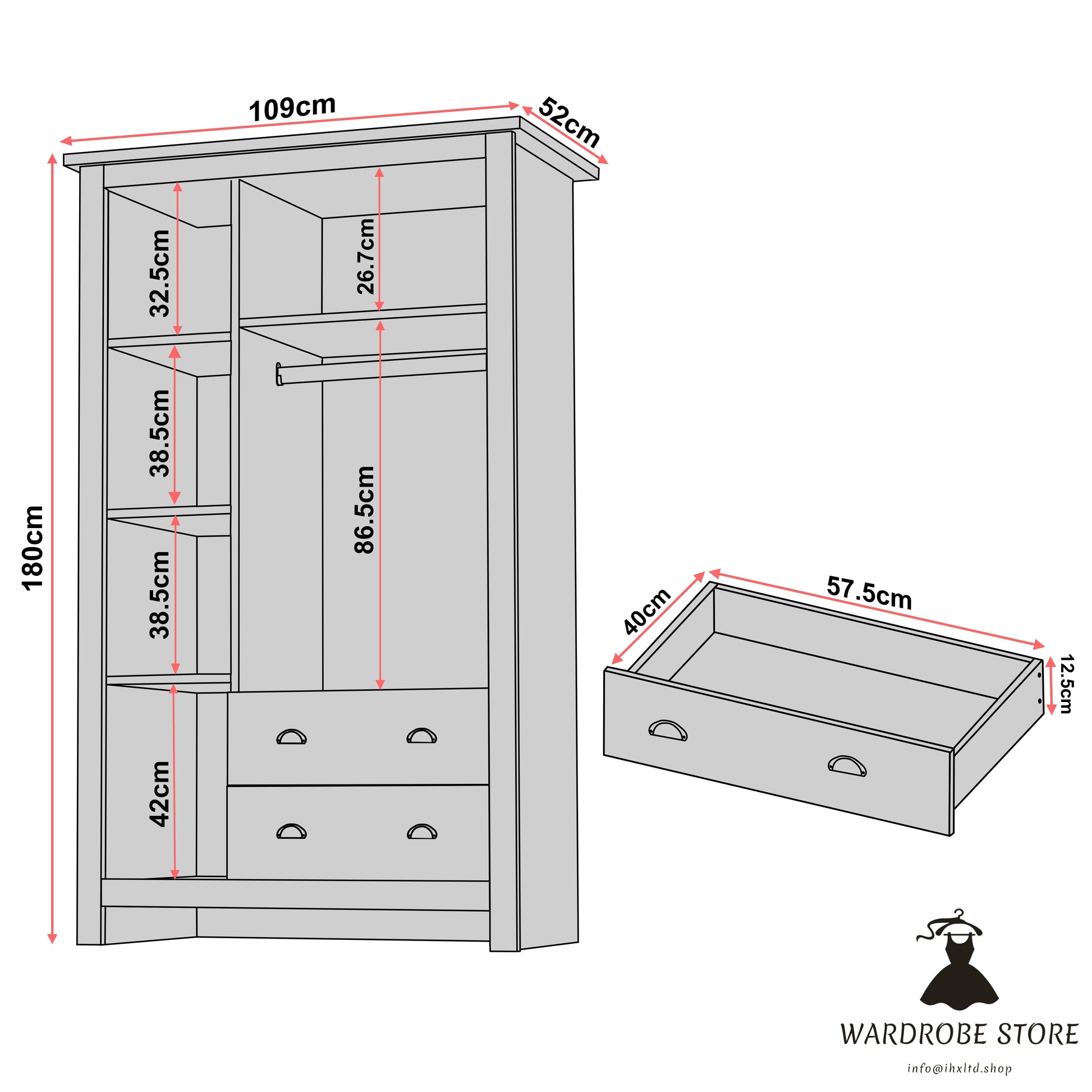 Package Included: 1 x 3 Door 2 Drawer Wardrobe, Assembly Instructions/ManualOverall Size:- Height: 180cm, Width: 109cm, Depth: 52cm
